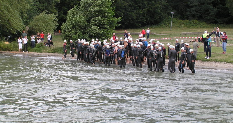 Am Samstag starteten zunächst die Damen auf der Sprintstrecke um 13:30. Das Schwimmen war sehr wellig, da ein sehr starker Wind wehte. Das Schwimmen wurde auf einer 750m Runde absolviert. Danach ging es in den etwas unübersichtlichen Wechselgarten, der vom Organisator etwas verwirrend für die Athleten aufgestellt wurde. Die 20 Km Radstrecke begann mit einem 1,5 Km langen 6% Anstieg, und war sehr schwer gleich nach dem Schwimmen zu fahren. Der sich im Schwimmen angedeutete Wind, wehte auch auf der Radstrecke, die doch etwas hügelig war, was auf der Landkarte nicht unbedingt zu vermuten war. Die abschliessende Laufstrecke ging über einen Wald- und Wiesenweg, der einen steilen 300m Berg Anstieg beinhaltete. Unsere Mädels kamen mit diesen schwierigen Bedingunen am besten zurecht, und belegten mit der Mannschaft den ersten Platz, A. Finger (2), D. Haase (4) und J. Hänsel auf (12) waren für diesen ersten Platz verantwortlich.