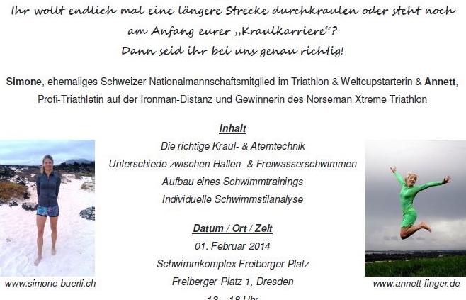 Da die Plätze des vereinseigenen Schwimmseminars nicht für alle Interessenten genügt haben, wollen wir euch auf das Angebot von Simone und Annett aufmerksam machen.