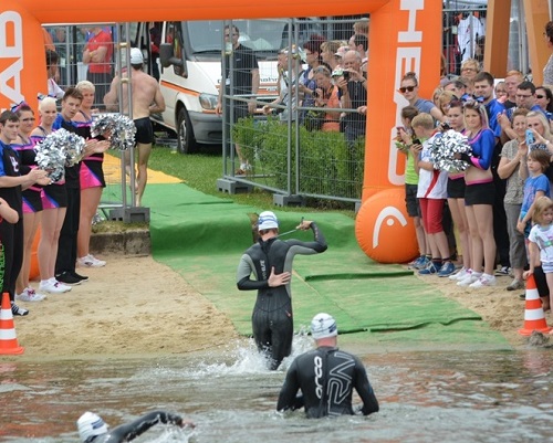 Also dafür, dass es mein „erstes Mal“ war, lief es ganz fluffig…wenn auch nicht perfekt! Da das Starterfeld auf 30 Sportler begrenzt war, gab es beim Start auch keine Schwierigkeiten. Das Rennen wurden durch Schützen gestartet und von Cheerleadern begleitet…Spektakulär! Das Schwimmen an sich lief eher so lala, ich kann noch nicht das Schwimmgefühl vom Training in den Wettkampf bringen, sehr Schade! Trotzdem kam ich nach 12:28 min als 3. Frau aus dem Wasser. 10 sec hinter der 2. (Lisa aus Heidelberg) und über eine Minute hinter der 1. (Antje aus Leipzig). Schnell aus dem Neo raus (ein neuer von Speedo, man kommt zwar sehr gut rein, aber schlecht raus L), Rad schnappen und los.