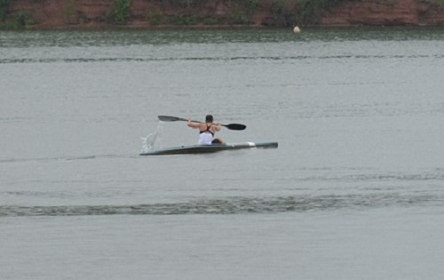 Mit knapp 2 min Vorsprung kam ich in die Wechselzone, stellte mein Radel ab und wollte schon zum Boot laufen, als mir einfiel, dass ich jetzt mein Liquid nehmen muss, sonst werde ich es nicht ins Ziel schaffen. Also noch mal zurück und Liquid geschnappt und rein damit. Boot geschnappt, vorsichtig im Wasser eingestiegen und los ging es…3 Runden, also 5 km. Schön lang und kraftvoll in alter Manier. Der Wind war nicht mehr so böig wie mittags, sehr gut zum Paddeln, geregnet hat es nun auch nicht mehr. In so einem schmalen Boot, kann es schnell passieren, dass man im Wasser liegt. Ich konnte meinen Vorsprung Runde um Runde ausbauen, aber mein linker seitlicher Rückenmuskel wollte so langsam zu machen…die ersten Anzeichen des zu späten Liquids.