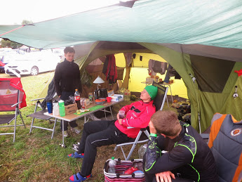 Strom verlegt, Wasser besorgt, Tisch und Stühle aufgestellt, wir waren so weit: Ach ja: Es gab ja auch noch ein wenig Equipment: 4 Mountainbikes, kistenweise Liquids und Riegel, literweise Wasser, Wasser und nochmal Wasser, dosenweise Iso, Tees, Kartoffelbrei, Obst, Brötchen, Waffeln, taschenfüllende Mengen an Radtrikots und Hosen, etc., Werkzeug für Heiko, sollte etwas repariert werden müssen, Ersatzschuhe, Ersatzhelme, Ersatzakkus, Ersatzmäntel, und, und, und trotzdem war nichts Überflüssiges rund um unser Zelt.
