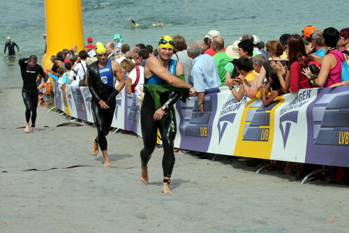Kurz vor knapp erreichten wir den Schwimmstart, schnell Neo fluten und los! Ich komme gut weg und finde eine gute Frequenz und bin schnell an der erste Boje. Auf dem weiten Weg zur zweiten Boje verliere ich die Orientierung und peile ein Rettungsboot an, das etwa 70m links von der Boje treibt. Egal, passiert und so war um mich rum schön viel Platz. Fehler korrigiert und auf Richtung Land. Als der Arm den Boden berührt, raus aus dem Wasser und den Berg Richtung Wechselzone hochgesprintet.