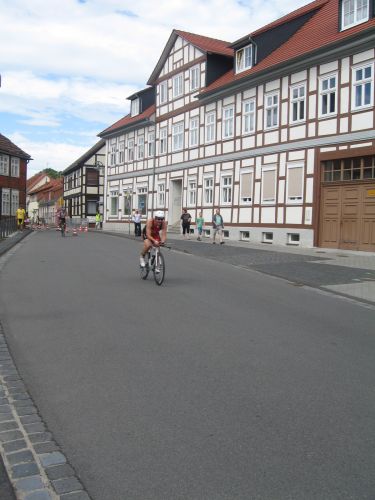 Aber nun ging es wirklich los. Die Radstrecke war eine komplett gesperrte Wendepunktstrecke, 3 x zu fahren. Fast flach, nur der Wind störte etwas. Lutscher-Gruppen gab es auch nicht, dafür 3 Kampfrichter, die die Sache gut im Griff hatten. Ein Wendepunkt war kurz vor der ehemaligen innerdeutschen Grenze – in den Westen wollte man uns wohl doch nicht lassen. Der zweite Wendepunkt war sehr zuschauerfreundlich auf dem Marktplatz. In der dritten Runde hatte ich Heino endlich eingeholt. Im Wechselraum galt es erst mal, meine Schuhe zu finden. Hier hatte ich mir den Laden in der abgesperrten Hauptstraße gemerkt, vor dem sie lagen. Also: auf Höhe NKD-Schild gegenüber der Eisdiele, hat geklappt.