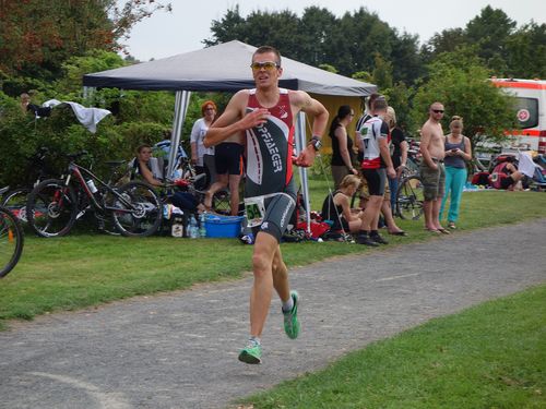 Martin stürzte sich wagemutig in der Startgruppe in den Teich und spulte die 360 m souverän mit nur wenigen Vorausschwimmenden ab. Maxs Position, der nach dem Abschlag an Land etwas konfus die Richtung suchte, war bei Wechsel zu Jörg aufgrund der bereits beginnenden Überrundung nicht mehr auszumachen. Jörg umplätscherte gleichfalls dutzende Brustschwimmer und nach etwas mehr als 12 Minuten schon war wieder Martin mit dem Radl an der Reihe.