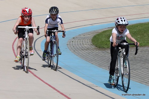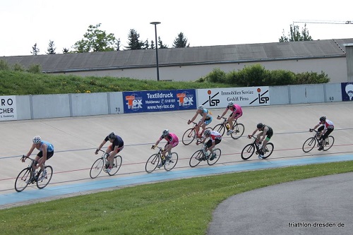 die Trainingsalternative noch nicht ganz bei uns angekommen, stürzte ich mich ins Getümmel. Der Lauf über 1000 m verging schnell, ebenso der Wechsel. Beim Rad dauerte es schon länger bis die 5 km Strecke (20 Runden auf der Radrennbahn Heidenau) vollbracht war und nach und nach reifte der Vergleich mit einer Münze heran. Ja, man fühlt sich schon nach wenigen Runden auf dem Rad, wie eine Münze die in einem Spendentrichter erst langsam, dann immer schneller ihre Runden zieht bis sie auf einmal ganz verschwindet – ist schon lustig. Jedenfalls spürte ich schnell, dass mir das Radfahren im Kreis ultra-amok-viel Spaß machte (Ja, so sagt man das heutzutage!!!). Auch der zweite Lauf führte durch einen kleinen (!!!) Tunnel aus dem Radstadion bis zum Wendepunkt und wieder zurück. Ergebnis: Die Zeiten aller waren so schnell, dass sie noch ein zweites Mal starten durfte, nur wurden diesmal ein Frauenfinale und ein reines Männerfinale ausgetragen.