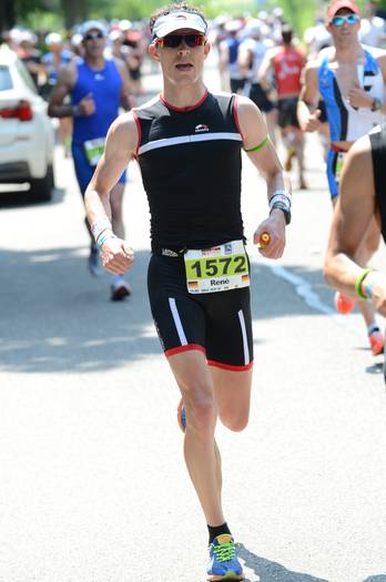 Der fühlte sich nun gar nicht so toll an, jedenfalls bereute ich unmittelbar auf den ersten 2km, dass ich Bergläufe nicht so intensiv trainiert hatte. Jedenfalls hatte ich den Eindruck, dass alle an mir vorbeiliefen, zwar keine Rentner auf Sonntagsauflug, aber immerhin andere! Also fügte ich mich in mein Schicksal und nahm es wie es sich darbot. Immer schön trinken und ausreichend kühlen, schließlich waren wahrscheinlich schon 25°C und die Sonne hoch am Himmel, weit und breit keine Wolke. Das hatte ich schon auf meiner Radfahrt analysiert. Nach der ersten von drei Laufrunden hatte ich recht gut in den Rhythmus gefunden, auch wenn die Zeiten allmählich langsamer wurden. Irgendwie hatte ich noch mit einer 1:35h für den Halbmarathon gerechnet, aber den Traum hatte ich zwischenzeitlich ad acta gelegt. Anständig durchkommen hieß die Devise. Vor allem, weil ab der zweiten Laufrunde wieder der Magen nicht ganz mitspielte. Keine Übelkeit, aber irgendwie schien er unglücklich mit dem, was ich ihm da während der letzten vier Stunden unter Vollbelastung verabreichte. Alle Ratschläge von Simone hatte ich befolgt, das Müsli mit Quark auch weggelassen. Ohne weitere Probleme schaffte ich den Halbmarathon letztendlich auch noch ins Ziel, wo mich nach 1:44h Rentner auf Sonntagsausflug applaudierend empfingen. War wohl nicht so schlecht für den ersten Mitteldistanztriathlon, dachte ich und war froh, den warmen Tag nach 5:08h endlich zu Ende gebracht zu haben.