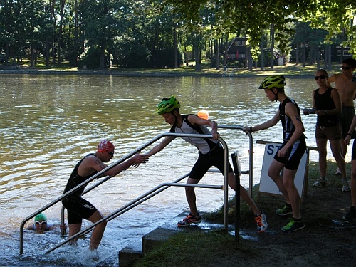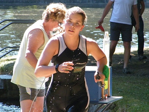 2 Jungen/ 1 Mädchen + 2 Mädchen /1 Junge – absolvierten jetzt die Hatz im A-B-C- System – immer in der Reihenfolge Schwimmen – Rad – Lauf. Vorsichtshalber hatten sich die Sportler ihre Reihenfolge auf den Handrücken geschrieben. Kommentar von außen: „…siehst du durch?…“; „…nee, aber die müssen's ja wissen!…“ Das völlige Durcheinander hat System! Schon nach dem 1. Durchgang waren die Leipziger vorn und bauten kontinuierlich die Führung aus. 2. war Klingenthal, 3. Riesa und knapp dahinter der Regionalsieger aus Dippoldiswalde/ Altenberg, die sich allerdings Einiges vorgenommen hatten.