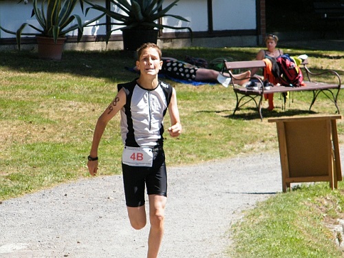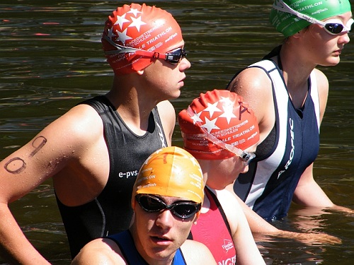 2 Jungen/ 1 Mädchen + 2 Mädchen /1 Junge – absolvierten jetzt die Hatz im A-B-C- System – immer in der Reihenfolge Schwimmen – Rad – Lauf. Vorsichtshalber hatten sich die Sportler ihre Reihenfolge auf den Handrücken geschrieben. Kommentar von außen: „…siehst du durch?…“; „…nee, aber die müssen's ja wissen!…“ Das völlige Durcheinander hat System! Schon nach dem 1. Durchgang waren die Leipziger vorn und bauten kontinuierlich die Führung aus. 2. war Klingenthal, 3. Riesa und knapp dahinter der Regionalsieger aus Dippoldiswalde/ Altenberg, die sich allerdings Einiges vorgenommen hatten.