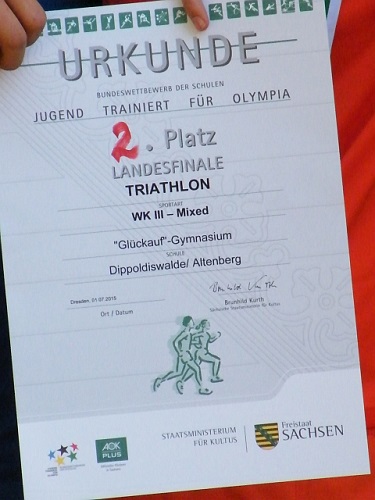 Sportlich überragend und verdient Sieger: Landesgymnasium für Sport Leipzig! Das stellt ja auch das Gross des Landesstützpunkt für Triathlon – aufgewertet durch Schwimmer, die sogar richtig gut laufen konnten! Wünschen wir ihnen für Berlin einen Platz Top DREI!!!! Großes HALLO bei den Dippsern mit den Altenberger Biathleten in der Schulkombination, als sie zum Vize-Landesmeister 2015 ausgerufen wurden. Ganz knapp von dem Dresdener Regionalsieger geschlagen- aber in diesem Jahr die Überraschung:
