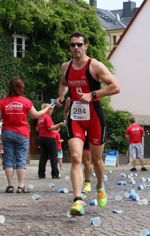 Um 11 Uhr erfolgte der Start der Männer. Als einziger Dresdner Sportler konnte Rudi im Vorderfeld mit schwimmen. Im Gegensatz zu David, der oft mit uns trainiert, im Wettkampf aber für Gera startet, gelang Rudi leider nicht der Sprung zur vierköpfigen Spitzengruppe. Er hielt sich den gesamten Radpart über in der Verfolgergruppe und machte ausserlich einen guten Eindruck, so dass gewisse Hoffnungen hinsichtlich der Endplatzierung bei den Betreuern erwachten. Dahinter folgten Danny und Grahlo in Gruppe drei bzw. vier. Für etwas Puls sorgten Nico und Andi, die fast dem gesamten Feld den Vortritt liesen – das musste doch nicht sein! Auf dem Rad fuhren dann beide was ging und so konnten sie noch ein paar Athleten einsammeln. Da sich beim Radfahren nicht so viel wie gewohnt änderte, sah es gar nicht gut mit einer guten Platzierung für das Team aus. Zu viele Erfurter, Neuhausener, Cottbuser, Geraer und natürlich Berliner lagen vor unserem vierten Mann. Etwas Hoffnung hatte ich noch, lagen doch Rudi und Danny gut im Rennen und Nico hatte mir gesagt, dass er immer eine 16:05 auf die 5 Kilometer laufen kann. Dieser Hoffnung wurde jäh zerstört, als ich Rudi um die Ecke traben sah. Ihm fehlten aufgrund einer Verletzung wichtige Trainingskilometer, so dass er weit unter seinem Anspruch lief. Danny machte wie erhofft Platz um Platz gut und schaffte in der letzten Runde noch den Spurt auf Platz fünf. Nico startete seine Aufholjagd wie angekündigt. Es war ein gar festlicher Anblick mit welchem Geschwindigkeitsüberschuss er Athlet um Athlet kassierte. Bis auf Rang 14 spülte ihn sein Lauf nach vorne, super! Grahlo kämpfte und ackerte in gewohnter Manier bis das Schweißband überquoll. Er wurde mit einem guten 17. Platz belohnt. Andi, dem ich auf dem Rad noch zugerufen hatte, dass er für Nico arbeiten solle, hatte inzwischen Rudi überlaufen. Taktisch unklug feuerten wir ihn beim Schlussspurt an und beraubten ihm so des Überraschungsmomentes. Er kam auf Platz 32 ein.