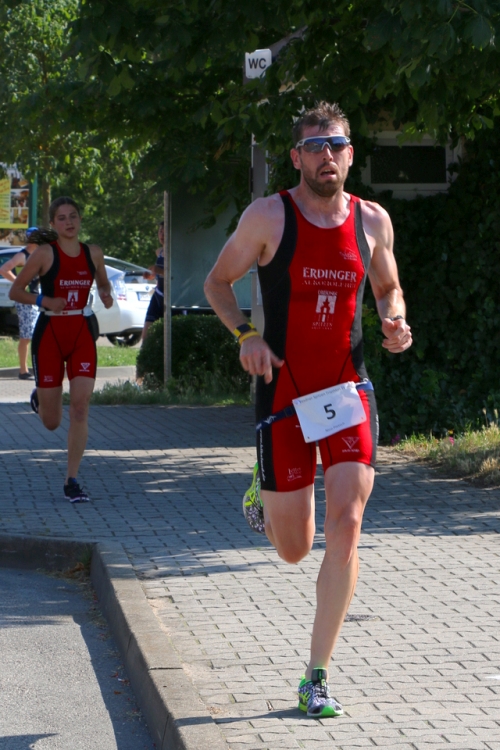Die Masters starteten 10 min später und hatten die gleiche Strecke zu bewältigen. Nach dem Startschuss setzte sich sogleich in bekannter Manier Gert, the Fish, Fischer an die Spitze und baute seinen Vorsprung bis zum ersten Wechsel auf knapp 2 min aus. Katja folgte im vorderen Drittel, Jörg im Mittelfeld und Holm stieg im hinteren Drittel aus den Fluten. Für ihn beginnt der Wettkampf erst auf dem Rad. Und das hat er auch gezeigt. Auf dem Rad pflügte Holm durchs Feld und durch seinen sehr guten Lauf schob er sich noch vor auf den 6. Platz. Gert profitierte immerhin teamintern bis zuletzt von seiner Schwimmdominanz, so dass er als 2. vom Team als 22. einlief. Katja machte einen sehr guten Wettkampf in dem Männerfeld und schloss als 25. einige Sekunden vor Jörg ab, der 28. wurde. Das Mastersteam erreichte damit den 6. Platz in der Tageswertung und kletterten damit in der Gesamtwertung einen Platz nach oben auf die 7. Schade, dass die Boni für Damen und ältere Männer abgeschafft wurden, sonst sähe die Tabelle sicherlich anders aus.