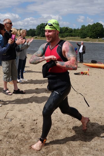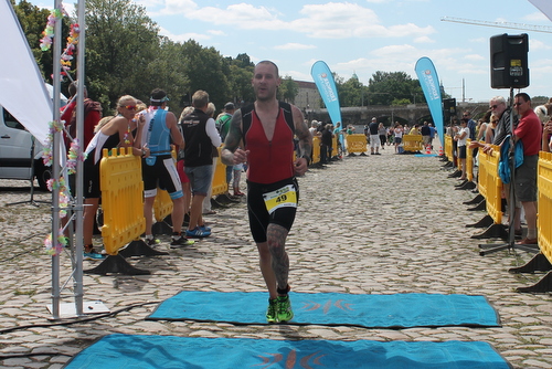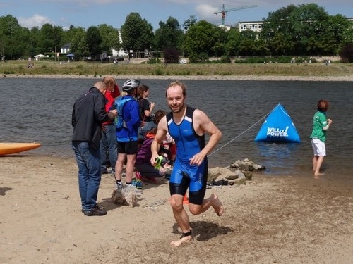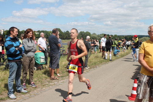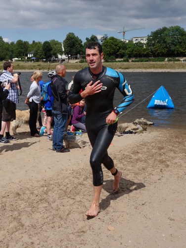 Kurz nach der Brücke waren dann auch die ersten Athleten der Sprintwelle eingeholt. Weiter ging es dann an den Elbwiesen bis nach 33 Minuten der Ausstieg erreicht war. Um die Strömung voll auszunutzen bin ich bis knapp vor dem Ufer weiter geschwommen. Wackelig ging es über Steine und später Sand auf den Elberadweg zur Wechselzone. Zum Glück haben mich keine Scherben erwischt.