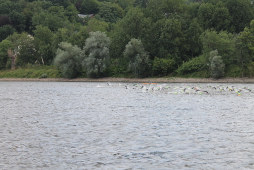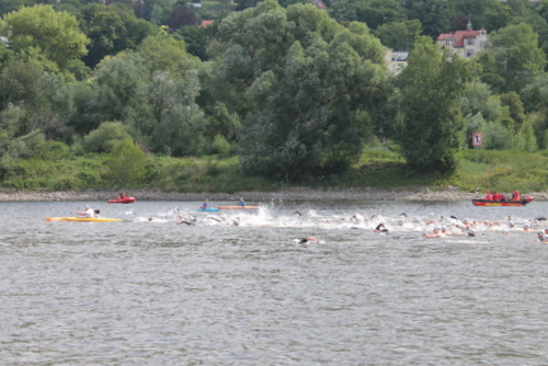 15 Minuten vor dem Start, nach Abgabe der Wechselklamotten, habe ich mich dann ins Wasser aufgemacht. Dank der Schwimmschuhe, die ich später meiner Frau aus dem Wasser geworfen habe, konnte ich den Scherben einigermaßen gelassen entgegen sehen. Dies war das 1. Mal, dass ich in die Elbe gestiegen bin und war somit eine interessante Erfahrung. In der Flussmitte konnte man tatsächlich, hüfthoch mit Wasser bedeckt, stehen. Es ist also was dran wenn man sagt, dass man im Sommer durch die Elbe laufen könne. Die Strömung ist in der Mitte allerdings recht stark.