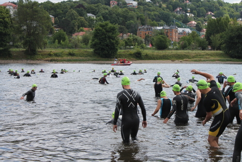 Nach der Einrichtung habe ich mir dann die Umgebung angeschaut, also den Schwimmausstieg, den Weg zur Wechselzone über den Elberadweg und den Weg zur Radstrecke. Diese führte Böschung auf einer Pflastersteinstraße hoch. Beim Schwimmausstieg geht es erst über relativ steiniges Gelände aus dem Fluss raus um dann auf einer kurzen Sand- und Wiesenstrecke auf den Elberadweg zu gelangen. Der Sand breitete mir die größten Sorgen, da der Veranstalter entlang der Uferlinie vor Scherben gewarnt hat. Leider bin ich auch fündig geworden, so dass ich einige Scherben aufgesammelt und entsorgt habe. Zwar habe ich mir für den Einstieg ins Wasser noch kurzfristig Wasserschuhe besorgt, aber die dürfen im Wettkampf laut Sportordnung (die Füße müssen frei bleiben) nicht getragen werden. So habe ich mir für den Ausstieg vorgenommen, lieber langsam zu machen.