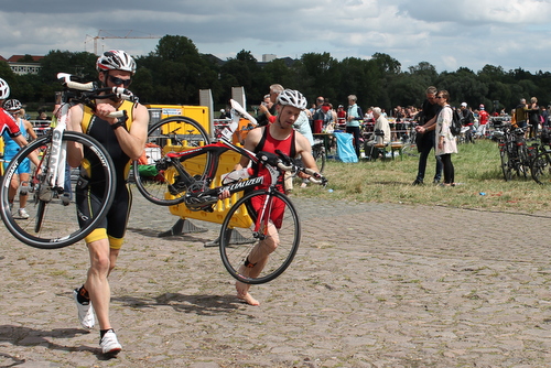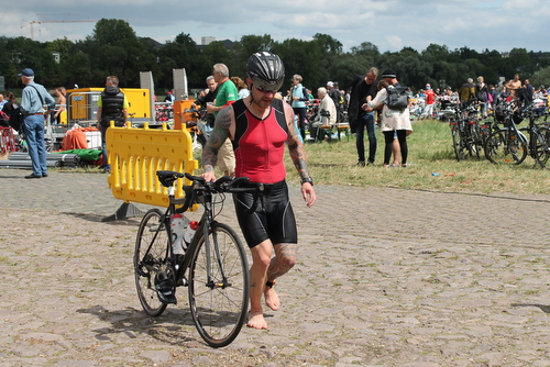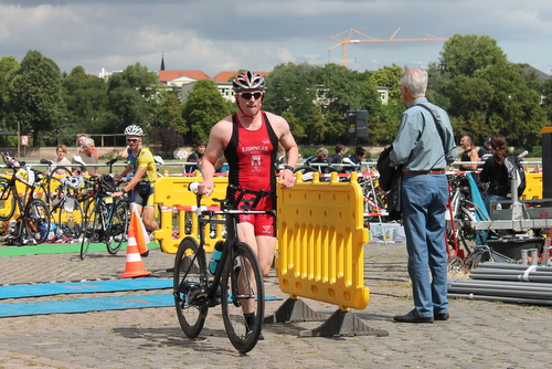 Am Wettkampftag ging es für mich um 08:30 Uhr von zu Hause los Richtung Wechselzone. Da ich diesmal mit Fahrrad anreisen wollte und damit nicht meine große Wettkampfkiste nutzen konnte, habe ich bereits am Vortag mein Fahrrad wettkampftauglich vorbereitet und den Rest in einen Rucksack gestopft. In der Wechselzone, unterhalb der Albertbrücke auf dem "Trödelplatz", ging ich das übliche Prozedere der Einrichtung des Wechselplatzes durch. Die Wechselzone bestand aus 2 langen Reihen mit den olympischen Startern auf der linken Seite und den Sprintern auf der Rechten.