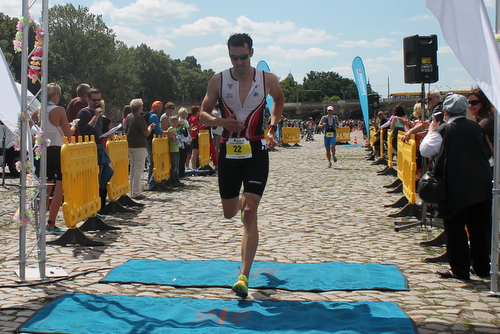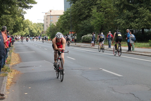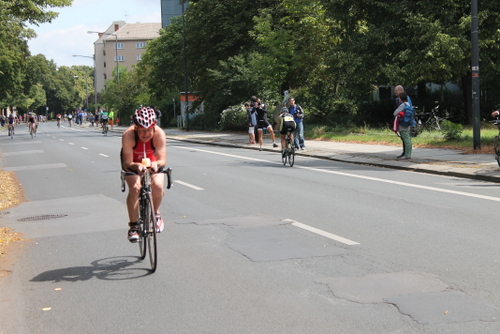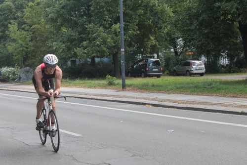 Nach einem vorschriftsmäßigen Wechsel ging es dann einen Anstieg hinauf zur Radstrecke. Da der Weg aus grobem Pflasterstein bestand, habe ich mich diesmal entschieden, das Rad zu tragen. Oben angekommen schwang ich mich aufs Rad und los ging die wilde Fahrt. Da die Sprinter bereits einige Zeit auf der Strecke unterwegs waren, war die Radstrecke schon recht voll und somit das Windschattenverbot nur schwer einzuhalten.