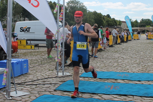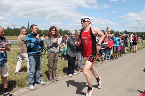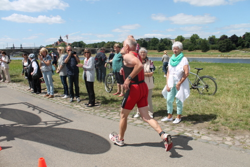 Auf der Strecke lieferte ich mir einen regelmäßigen Schlagabtausch mit einem anderen Athleten, der mal vor, mal hinter mir unterwegs war. Auch auf der Strecke konnte man den Blick über die Elbe auf die Wiesen und Schlösser genießen. An dem, an der Wechselzone liegenden, Wendepunkt war auch ordentlich Stimmung durch Zuschauer.
