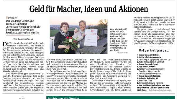Mit Bekanntgabe des Ergebnisses wurde die Arbeit des TV Dresden als 3. der Kategorie Sport und als 2. im Publikumsvoting über alle Kategorien (256 von knapp 2000 Stimmen, hinter dem Erstplatzierten bei 291 Stimmen) mit € 1.000 gewürdigt.