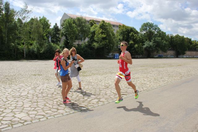 Fix gewechselt und ab aufs Rad. Nach dem Schwimmen war das Ziel recht klar: So schnell es geht vor auf Position Eins fahren. Die Beine fühlten sich gut an und ich machte von Beginn an Druck. Nach ca. 4km war es dann soweit, zum ersten Mal bei einem Triathlon überhaupt konnte ich „Führungsluft“ schnuppern. Zugleich war es ein ordentlicher Motivationsschub diese Position nicht mehr herzugeben. Bis zum Ende des Radfahrens konnte ich den Vorsprung weiter ausbauen und mit einem guten Polster in den finalen Lauf gehen.
