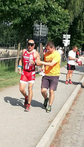 Noch in der Wechselzone riet mir Carsten, keinen Stress zu machen und ganz locker zu bleiben, zumal ich gut im Rennen lag. Nun ging´s auf die Laufstrecke und Carsten empfahl mir, an den Verpflegungsstellen langsamer zu machen, um mich zu erholen. Kurz nach dem Verlassen der