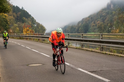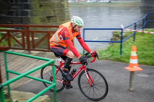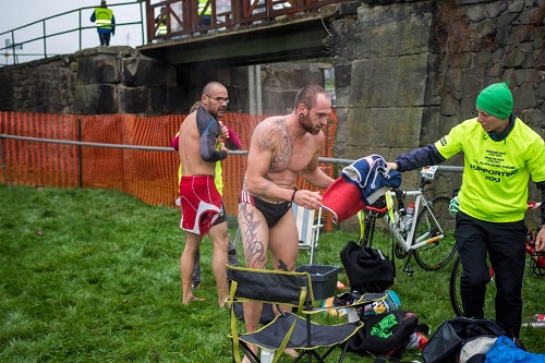 1:10 Uhr!!! riss uns der Wecker aus dem Schlaf. 2:15 Uhr kam Heiko mit dem Support-Ford, fix beladen und ab nach wieder Decin. Von da aus ging es mit der Fähre 3:40 Uhr für die Sportler 8,3 km flussaufwärts zum Start. Durch starken Nebel verzögerte sich der Start um sagenhafte 1h25min! 6:25 Uhr fiel dann endlich der Startschuss. Wir sprangen aus ca. 2m Höhe von einer Anlegestelle ins kalte Nass. Durch das geliehene Neoprenequipment wie Schuhe, Weste und Kappe war es gut auszuhalten und ich konnte dennoch gut schwimmen. Nach einer gefühlten Ewigkeit, erreichte ich nach einer Stunde als 5. die erste Wechselzone. Jetzt hieß es: Alles Nasse aus, trockene Radklamotten an! Und ab auf das Rad!