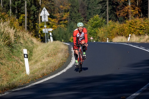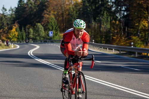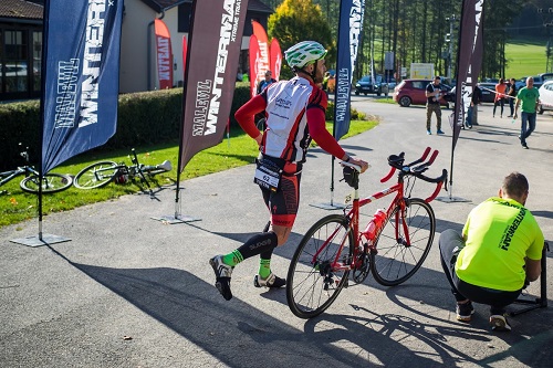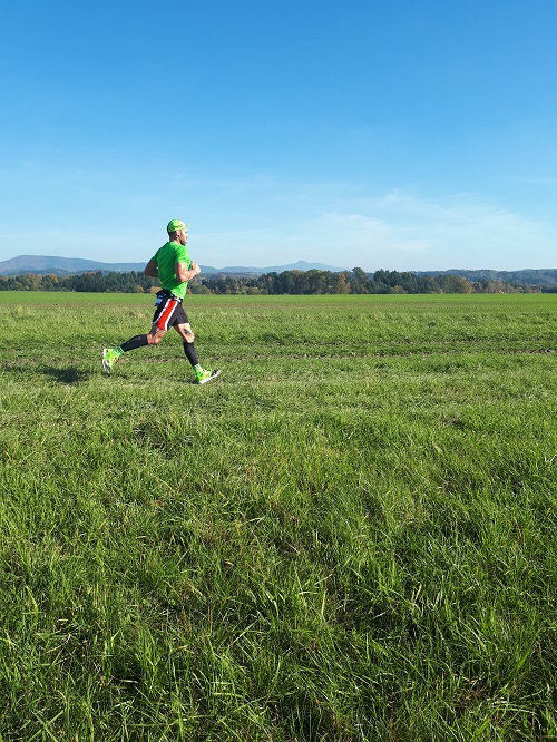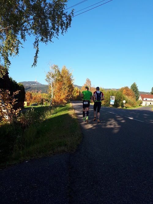 Es lagen 180 km mit ca. 3200 Höhenmetern vor mir…dementsprechend entspannt bin ich los und versuchte meinen Rhythmus zu finden. Essen, Trinken und nicht überziehen war für mich die Devise. Durch die super Betreuung durch Heiko und Susi mit allem, was ich brauchte, konnte ich recht konstant mein Ding auf dem Rad durchziehen. Bruder Rocco und Papi Norbert waren nun auch immer wieder am Streckenrand, so dass Ich immer gut gepusht wurde. Ich merkte, dass meine Kontrahenten am Anfang zwar etwas zügiger unterwegs waren, dem hohen Anfangstempo aber etwas Tribut zollen mussten. Die Streckenabschnitte mit den kurvigen und rasanten Abfahrten lagen mir sehr und genoss ich mit einem breiten Grinsen im Gesicht. Die letzten 50 km waren dann doch etwas zäh, da man schon so lange unterwegs war und die tschechischen Straßen mit rauem Asphalt und diversen Schlaglöchern den Rest gaben. Onkel und Tante waren nun auch mit dem Motorrad an der Strecke. So sehnte ich mir den zweiten Wechsel herbei. Dieser war auf der Malevil Ranch, welche ich nach 6h15min im Sattel als nun 3. erreichte. Ich schlüpfte fix in meine Laufkleider und begab mich auf den Weg zum Jeschken.