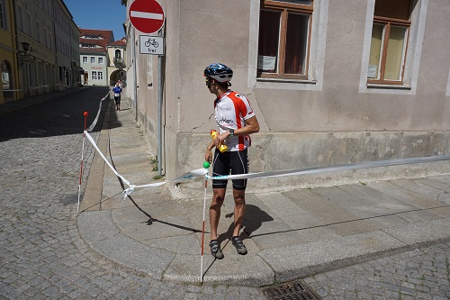 Am Anfang des bergigen Teiles der zweiten Runde merkte ich deutlich wie meine Kraft nachließ, sodass ich meine Radgruppe ziehen lassen musste. Ich versuchte mir mit meiner dürftigen Verpflegung Abhilfe zu verschaffen, was eher mäßig gelang. So trudelte ich eher schlecht als recht Richtung Kamenz zurück. Als ich am Pflaster der Innenstadt wieder ankam machte sich das volle Ausmaß meiner fehlenden Verpflegung bemerkbar. Ich hatte nicht einmal mehr die Kraft den kleinen Anstieg bis zum Wechselgarten zu bewältigen. Als einer der Helfer sich nach meinem Befinden erkundigte sah ich ein, dass es keinen Sinn mehr hatte weiter zu machen. Ich klickte meine Schuhe aus und stürzte beim Absteigen sogar noch über mein Rad. Sofort war ein Sanitäter bei mir und ich bekam etwas zu trinken.
