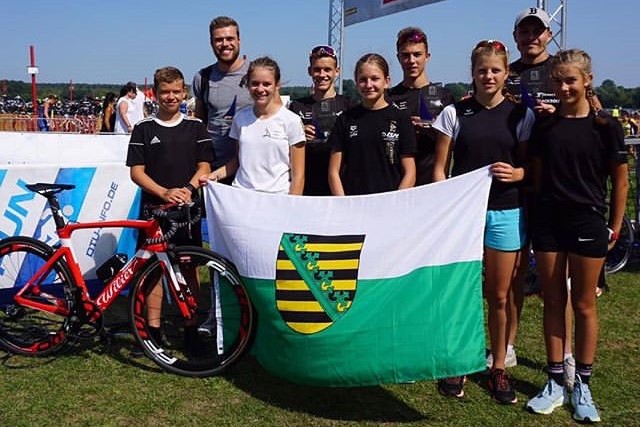Voller Vorfreude ging es am Freitag bereits zur Länderparade und Nudelparty nach Grimma. Am nächsten Morgen mussten wir recht früh raus, aber was tut man nicht alles für seinen Sport. Eine Besonderheit war für uns, dass wir das erste Mal in zwei Wechselzonen einchecken mussten. In der Ersten lief alles problemlos, aber in der Zweiten gab es ein Problem mit Claras Fahrrad. Das Sperren von Gängen ist nämlich nicht zugelassen und deswegen sollte Clara nicht gewertet werden. Das war natürlich eine unfassbare Enttäuschung, da die Teilnahme an der DM Claras Ziel gewesen ist.