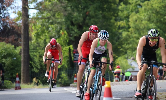 Die Radstrecke hatte es mit einer 12%igen Abfahrt und einem ähnlich steilen Anstieg echt in sich, aber bisher lag mir das Radfahren immer sehr gut. Am ersten Berg konnte ich schon auf die zwei führenden Mädels auffahren. Es machte echt Spaß die Berge zu erklimmen und die Abfahrten zu genießen. Dennoch war Vorsicht geboten, da es auch sehr anspruchsvolle Wenden oder 90°-Kurven gab. Zusätzlich war das Windschattenfahren freigegeben, auch über die Altersklassen hinweg. Deshalb fuhr sich in der ersten Runde relativ schnell eine Führungsgruppe über ca. 7 Athletinnen (mich inbegriffen) zusammen. In der zweiten (und letzten) Runde gelang es einer Schweizerin und mir, sich am Berg abzusetzen und eine kleine Lücke zu reißen. Dies beflügelte zusätzlich und zauberte mir ein Lächeln ins Gesicht.
