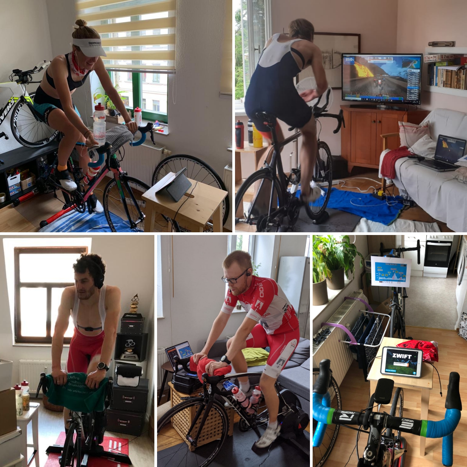 Endlich?! – Race-Day. Bei strahlendem Sonnenschein und perfektem Triathlonwetter setzten wir uns in unseren Wohnzimmern auf den Rollentrainer, um im Triathlonzirkus mitzumischen. Gut platziert in den vorderen Reihen der Startlinie fuhren wir uns die letzten Minuten vor dem Rennen gemeinsam locker ein. Verbunden über die App „Discord“ wurden die letzten Tipps ausgetauscht und viel Erfolg gewünscht. Dann hieß es um 10:00 für Björn, Otto, Marco, und Jens „auf die Plätze, fertig, los!“. Pauline, Anna Heyder, Anna Harbo und Sophie Lingelbach folgten fünf Minuten später. ‚Ja die Gruppe halten, aber nicht zu weit vorne oder hinten fahren, um den Windschatten auszunutzen oder den Anschluss nicht zu verlieren‘, ‚am Berg rechtzeitig die Wattzahl erhöhen, um keine Lücke aufreißen zu lassen‘ und dann ‚einfach aus den Beinen rausholen, was geht‘. Es wurde gestrampelt, gekämpft, geschwitzt und gelitten. Wir traten so fest in die Pedale wie möglich und gaben in unseren vier Wänden alles was ging. Da entstand schon die ein oder andere Schweißpfütze. Marco führte das Männerteam an und kam unter den Top10 ins Ziel (Platz 8). Darauf folgte Björn mit Platz 14. Jens (Platz 21) und Otto (Platz 34) vervollständigten das Team. Bei den Damen überquerte Pauline als erste – ebenfalls Top10 – die Ziellinie (Platz 10), gefolgt von Anna Harbo (Platz 17) und Anna Heyder (Platz 21). Sophie machte das Team komplett (Platz 27). Nach einer kurzen Verschnaufpause wurde fieberhaft gerechnet. Die Platzziffern der ersten drei Athleten werden gewertet. Welche Teamplatzierung wird drin sein? Und dann stand es fest, 3. Platz (!!) für die Damen hinter Viernheim und Team Bad Orb und ein starker 5. Platz für die Männer. Super gemacht!!