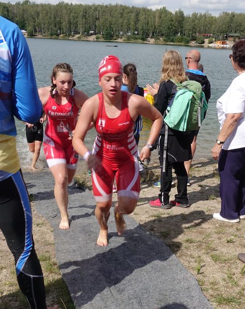 Dann sind wir Einchecken gegangen, bereiteten unsere Plätze vor und zogen die Einteiler an. Nach einem kurzen Lauf-ABC gings schon zum Start. Da alle Kinderaltersklassen zusammen starteten, war der Start ziemlich durcheinander. Aus dem hüfttiefen Wasser ging es los.