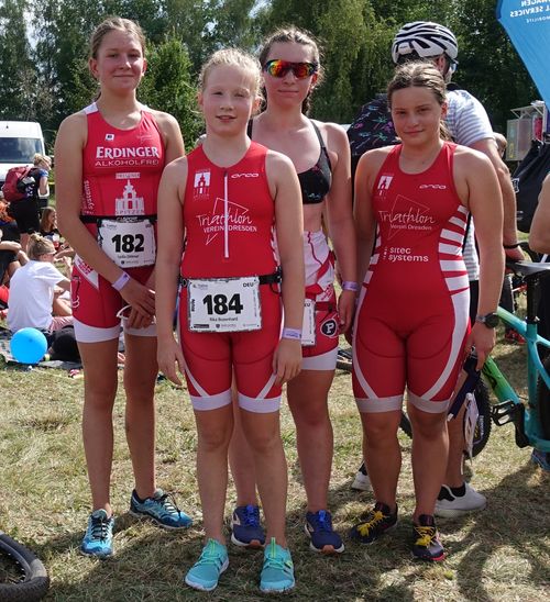 … denn an diesem Tag fuhren Hannah, Marleen, Lydia und ich mit unseren Familien in die Tschechei zum Cross-Triathlon. Als wir am Kristina-See in Hradek ankamen, warteten wir noch auf Lydia. Dann sind wir zum Check-Inn gegangen und breiteten unsere Decken aus.