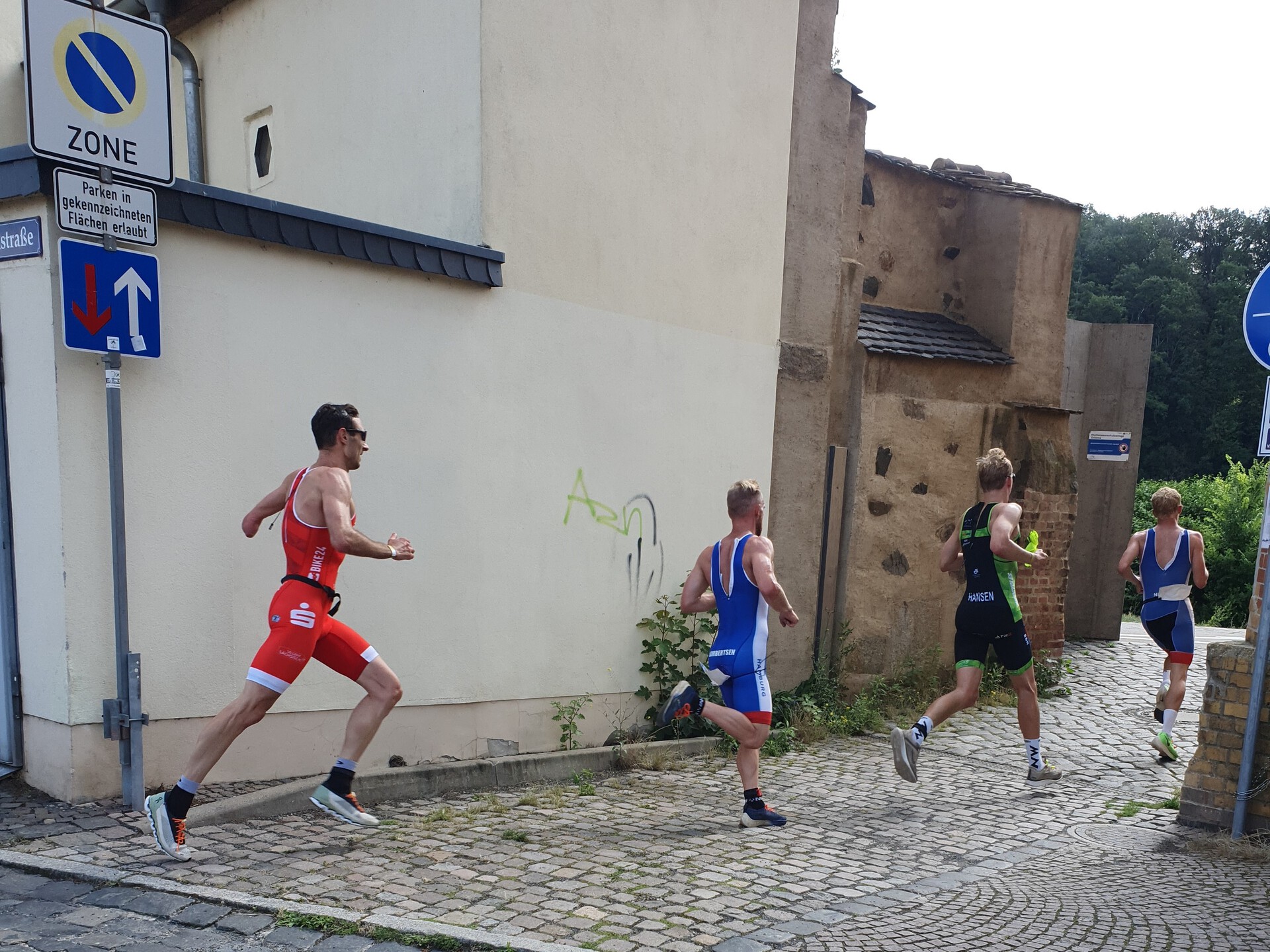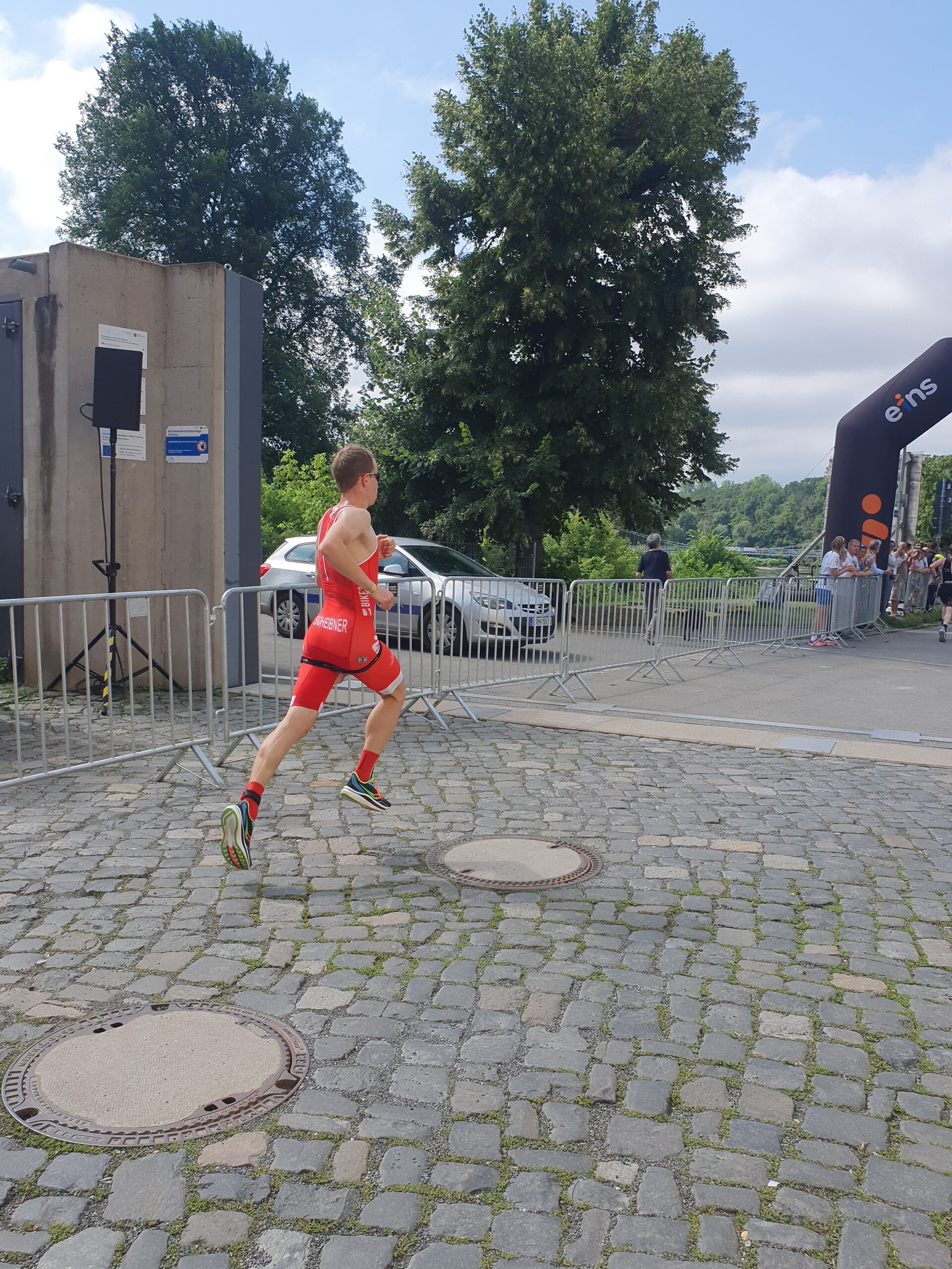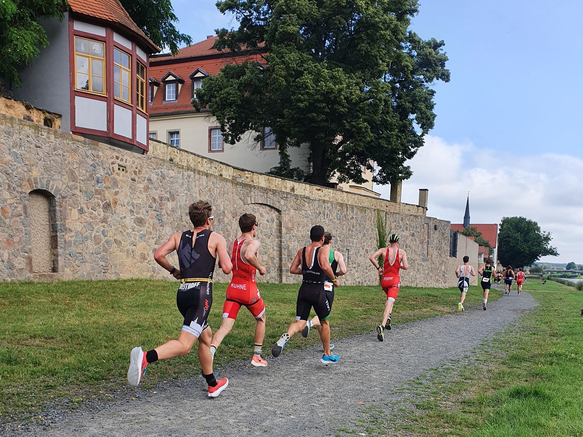 Gestartet wurde jeweils als Team in Abständen von 5 Sekunden in der Reihenfolge der Ligatabelle. An Platz 9 von 17 waren wir also für den Kampf um eine Radgruppe nicht schlecht positioniert. Nach dem Startschuss ging es über 250m Kopfsteinpflaster zur 1 km langen Laufrunde. Diese führte uns über 500 m Schotter an der Mulden-Promenade und 500 m feinsten Asphalt. Durch die kurzen Abstände zwischen den Mannschaften kam es beim 1. Lauf schon bald zu einer deutlichen Durchmischung des Feldes.