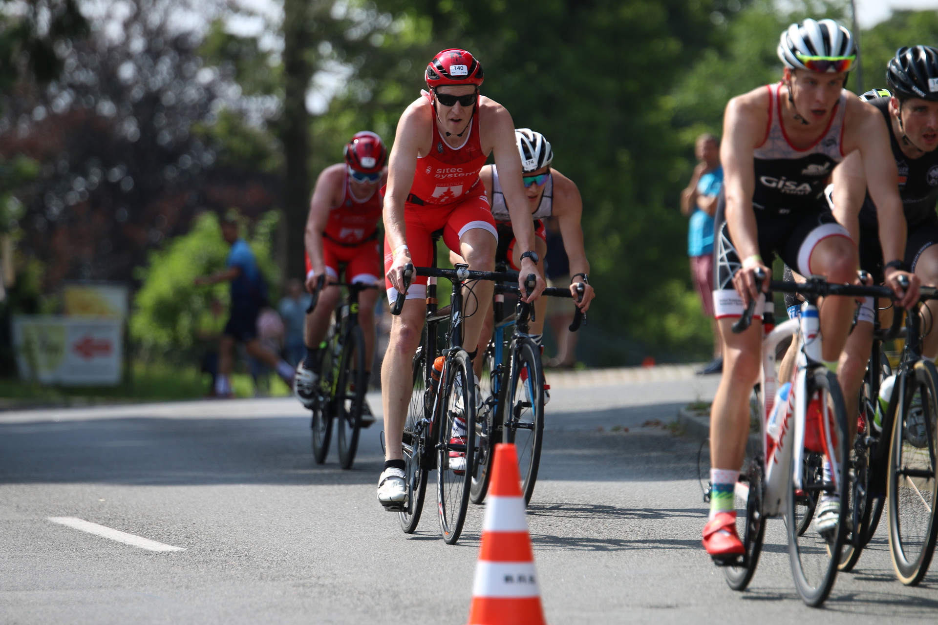 Gestartet wurde jeweils als Team in Abständen von 5 Sekunden in der Reihenfolge der Ligatabelle. An Platz 9 von 17 waren wir also für den Kampf um eine Radgruppe nicht schlecht positioniert. Nach dem Startschuss ging es über 250m Kopfsteinpflaster zur 1 km langen Laufrunde. Diese führte uns über 500 m Schotter an der Mulden-Promenade und 500 m feinsten Asphalt. Durch die kurzen Abstände zwischen den Mannschaften kam es beim 1. Lauf schon bald zu einer deutlichen Durchmischung des Feldes.