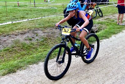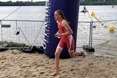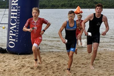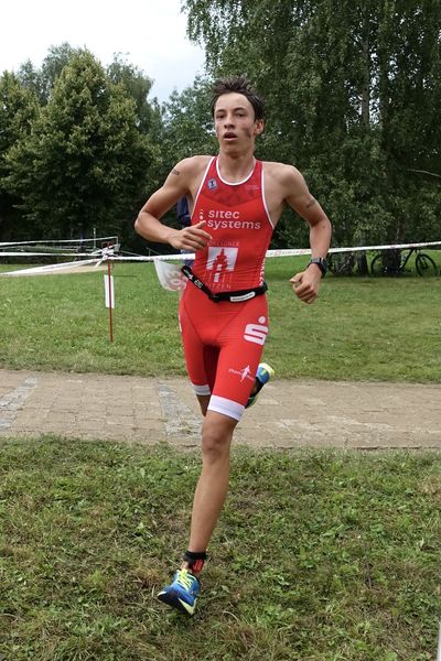 Till kam mit ein bisschen Rückstand nach dem Ersten nach dem Schwimmen aus dem Wasser. Ab aufs Rad, wo er bis zum Schluss auf den 1. vorfuhr. Ole, der als 3. aus dem Wasser kam, nahm die Verfolgung auf. Und auch für Naja, die bei den Mädels sehr weit vorne lag, ging es auf die Radstrecke. Finn und Stan wurden natürlich ebenfalls kräftig angefeuert. Jetzt hieß es auch für Ani ab aufs Rad und los ging’s. Rika und ich sind dann hin und her gerannt, um alle anzufeuern und schlussendlich bei der Laufstrecke stehengeblieben. Till kam schon und wechselte sogar noch vor Lasse zum Laufen. Mit kräftigem Gejubel feuerten wir erst Till und nach ihm dann auch Lasse, Tim und Ole an.
