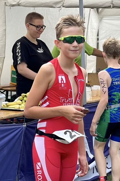 Um 13:00 Uhr war mein Start in der Altersklasse Schüler B. Ich konnte mich nach zwei Runden im Schwimmbecken absetzen und als erster in den Wechselgarten rennen. Die Radstrecke war für Autos komplett gesperrt und so konnte man ungestört 2 Runden fahren. Obwohl Windschattenfahren erlaubt war, konnte ich meinen Vorsprung etwas ausbauen.