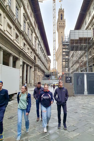 Natürlich haben wir in der Toskana nicht nur Training gemacht. Unsere Ruhetage haben wir genutzt, um uns auch mal zu Fuß in Italien etwas umzusehen. Deshalb ging es am ersten Ruhetag nach Florenz. Vormittags stand noch eine Schwimmeinheit auf dem Plan, die wir dort absolvieren wollten. Die „normale“ Schwimmhalle hatte leider nicht mehr genug Platz für uns – aber keine Sorge: einmal um das (große) Gelände rumgewandert und – sogar kostenlos – in die dort aufgebaute Traglufthalle rein – vier Kilometer Ohne-Leinen-Schwimmen.
