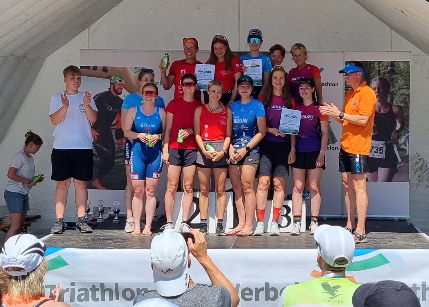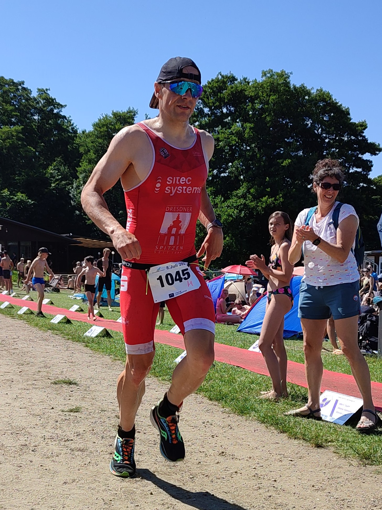 Bei hochsommerlichen 30 Grad starteten zuerst die Damen, wobei wir als Verein in 2 Sportgemeinschaften, TV Dresden + Erfurt und TV Dresden + Thüringen, vertreten sind. Geplant war eine Sprintdistanz, 750/20/5. Da die Helfer scheinbar noch die zuvor gestartete Jedermann Distanz im Hinterkopf hatten, wurde aus der offiziellen 5km Laufrunde kurzerhand eine 3,3km Laufrunde. Kann mal passieren. Fairerweise muss man sagen, dass die Organisation, Moderation und die zahlreichen Helfer das Event hervorragend begleitet haben. Als Teilnehmer hat das definitiv wahnsinnig viel Spaß gemacht. Schlussendlich konnten unsere Damen mit Platz 1 und 2 in der Gesamtwertung sowie Platz 1 und 3 in der Teamwertung Ihre derzeitige Dominanz unter Beweis stellen.