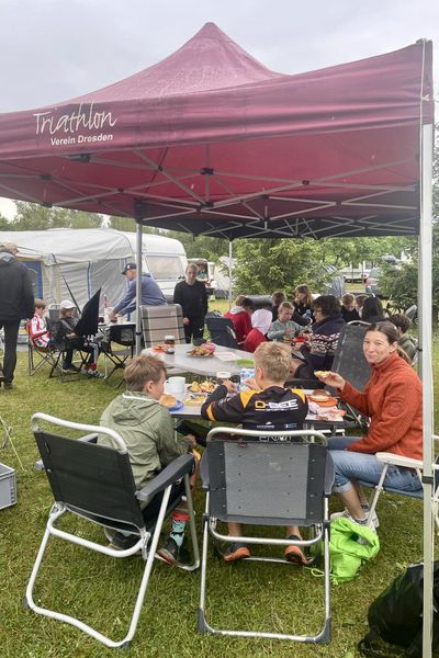 Am Morgen des 31. Juli 2023 starteten wir hochmotiviert und mit einem Kribbeln im Bauch Richtung Zittau nach Olbersdorf. Olbersdorf ist genau der Ort, wo jedes Jahr der Crosstriathlon O-See-Challenge stattfindet. Hier veranstaltete der TV Dresden ein Trainingslager für die eigenen Mitglieder sowie für Teilnehmer aus anderen Vereinen. Und wir durften dabei sein. Gleich nach der Ankunft wurden schnell die Zelte aufgebaut, damit wir pünktlich am Nachmittags-Radtraining teilnehmen konnten. Ganz anders als gewohnt, ging es nun mit dem Mountainbike durch den Wald – Berg hoch, Berg runter, durch Matsch und über Wurzeln.