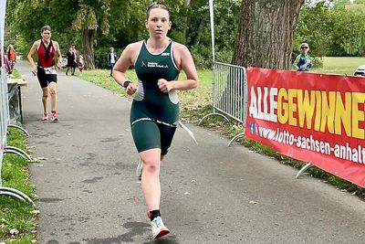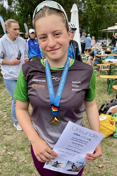 Am 06.08.2023 ging es für ein paar unserer Sportler nach Halle zur Deutschen Meisterschaft im Swim and Run. Am Sonntagmorgen startete Hannah als Erste über eine Strecke von 300 Meter Schwimmen und 3 Kilometer Laufen. Der Start war sehr stressig, da die Sportler kaum im Wasser waren, als der Startschuss fiel. Es ging 300 Meter mit der Strömung die Saale entlang. Nach einem etwas schwierigen Ausstieg ging es dann auf die Laufstrecke. Hier wurden 3 x 1 Kilometer gelaufen. Von Anfang an konnte Hannah hier das Rennen dominieren und sicherte sich so am Ende den Gesamtsieg und den Deutschen Meistertitel in der weiblichen Jugend A.