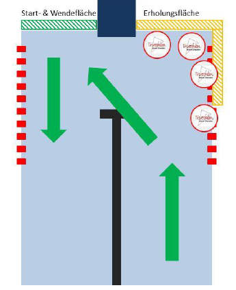 - Das Wenden wird durch Einordnen in Richtung der linken Bahnseite für nachfolgende Schwimmer und Pausierende deutlich angezeigt.