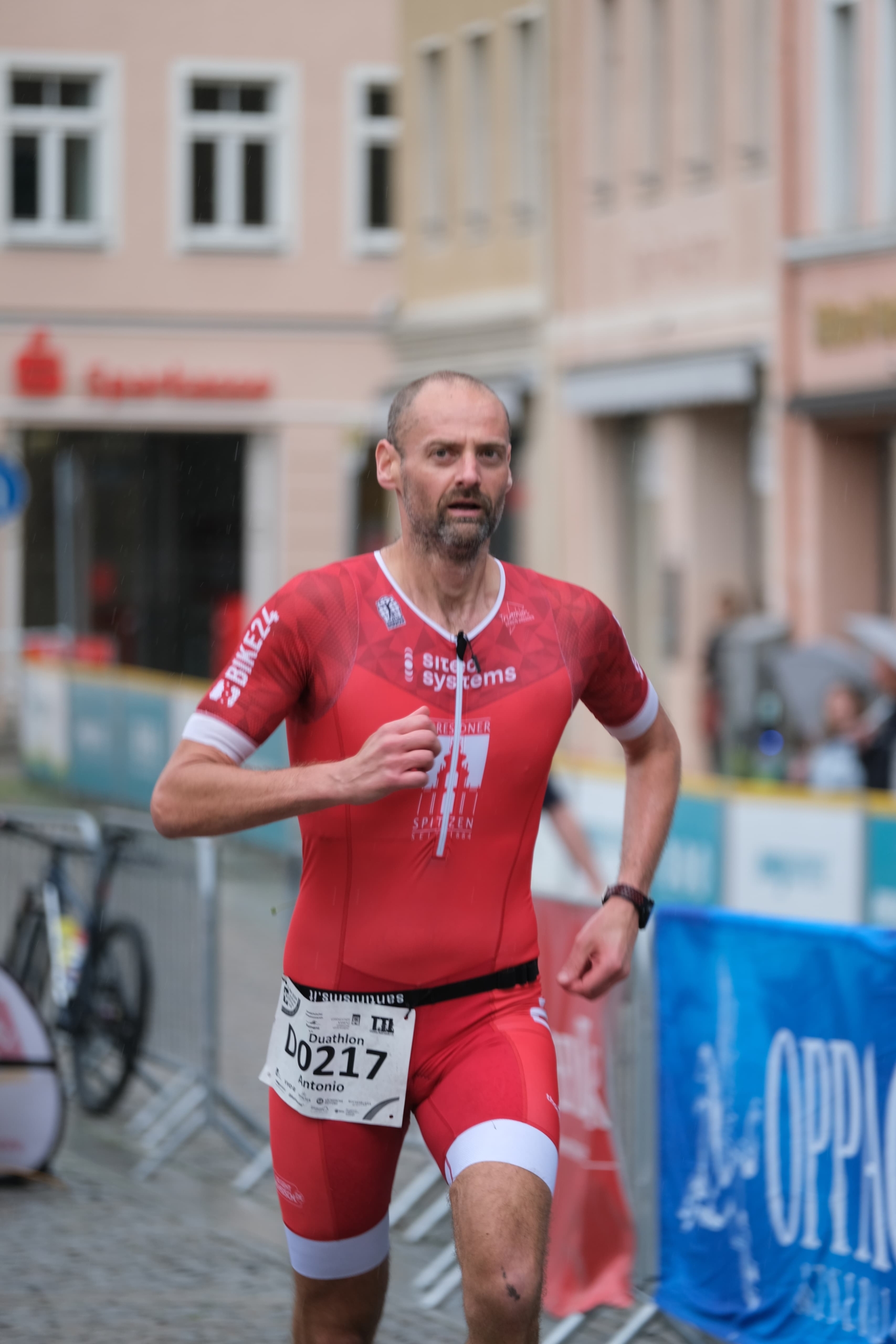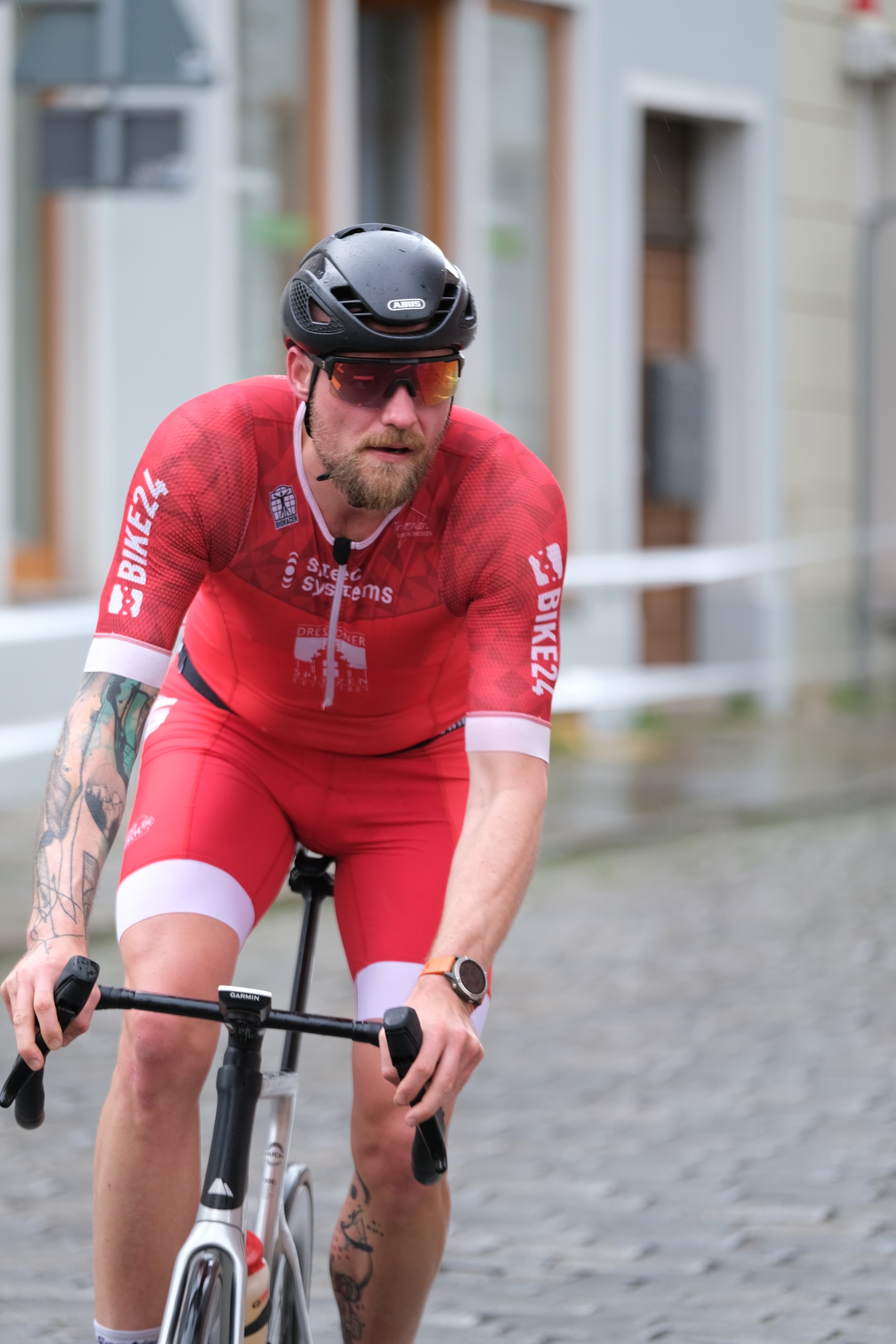 Wieder in der Wechselzone eingetroffen, zügig die Schuhe gewechselt und aufs Rad geschwungen. Der Rad Part über 27km über nassen Pflastersteinen verlief für alle reibungslos. Das Gelände war sehr anspruchsvoll und was für unsere Bergfahrer.