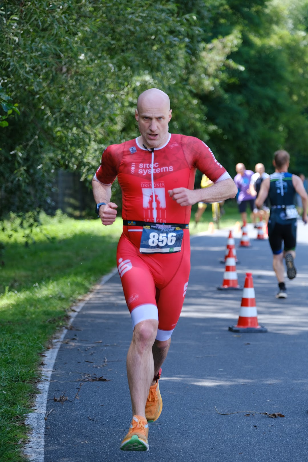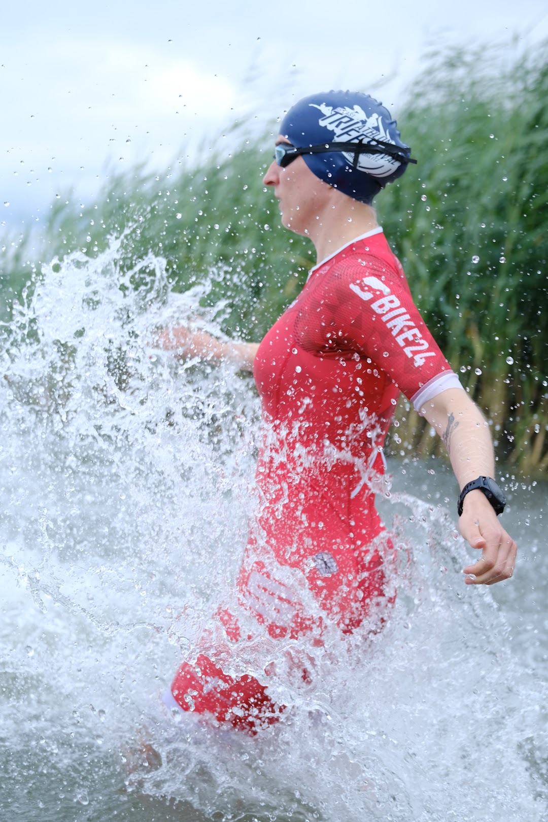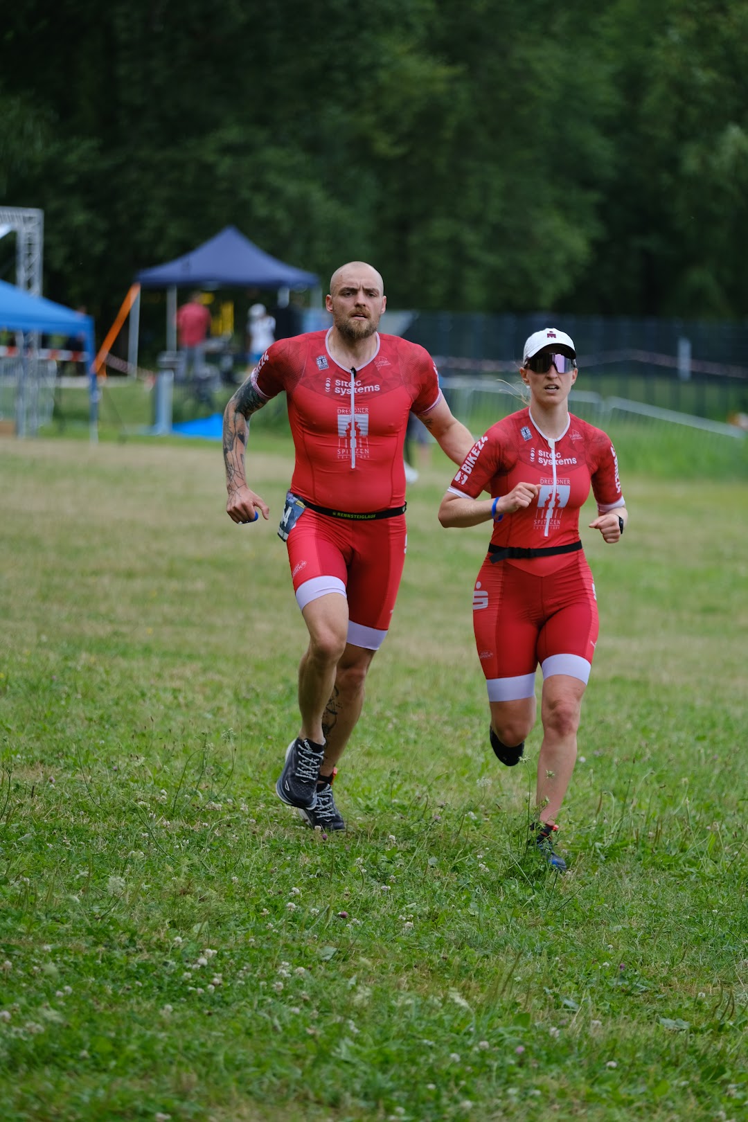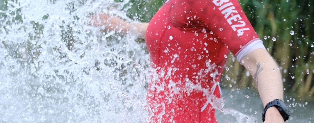 9:30 Minuten nach dem ersten Team stürzen sich Ines und Martin hoch motiviert in den Berzdorfer See und trotzen dem noch deutlich spürbaren Wellengang. Danach geht es flott auf den flachen Zweirundenkurs. Da sie das Team bilden, das geschlossen einläuft, schicken sie gemeinsam René und Simon zum ersten Schwimmen. Beide kommen zusammen in die Wechselzone, aber sie haben jetzt die Möglichkeit, einzeln zu übergeben. Also zündet René den Nachbrenner, um Ines und Martin bei noch eher frischen Temperaturen nicht allzu lange frieren zu lassen.