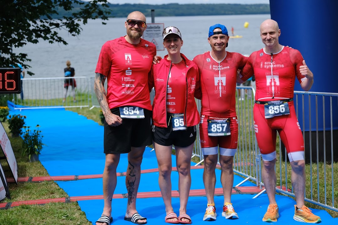 Ines und Martin meistern den zweiten Durchgang zusammen und für René und Simon geht es wieder ins Wasser. Auf der Laufstrecke mobilisieren René und Simon die letzten Reserven. René finisht für das gesamte Team und ein paar Minütchen später sind mit Simon alle im Ziel und freuen sich über ein gelungenes Rennen mit spannendem Wettkampfmodus.