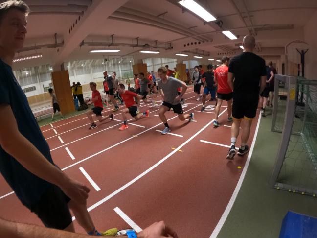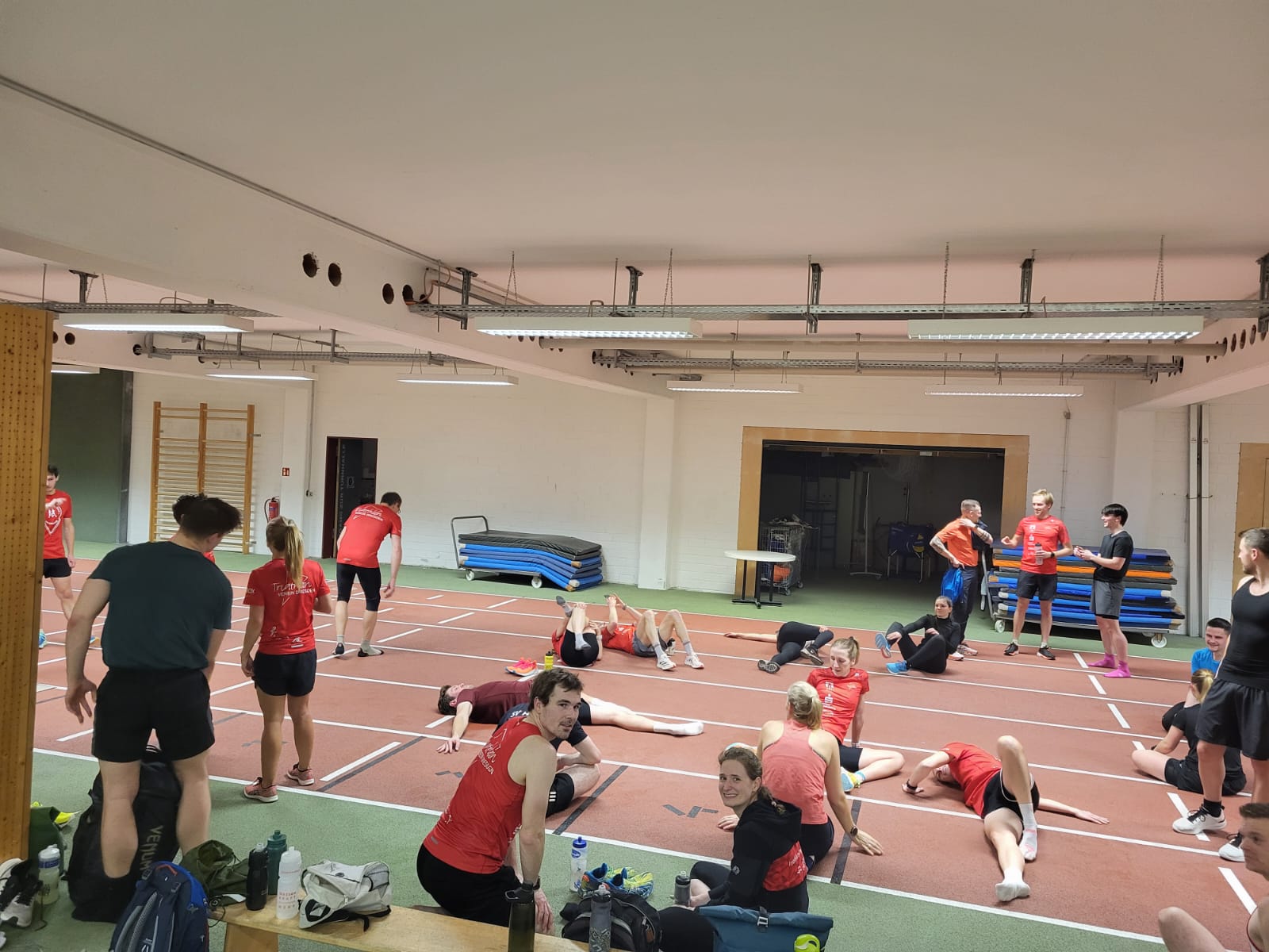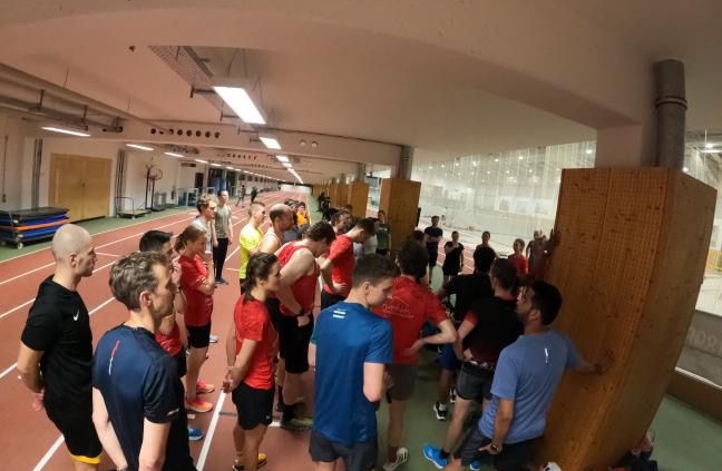 Ende Januar, es ist Dienstag kurz vor 19 Uhr – die DSC Laufhalle leert sich langsam, auch die Jugend des weltbesten Triathlonvereins läuft gerade aus. Doch halt nein, in einer Ecke tauchen immer mehr rote Punkte auf, gemischt mit vielen anderen Farben. 40 Triathletinnen und Triathleten mit einigen ‚Schnuppermitgliedern‘ scharen sich um Danny und Marco, unsere Trainer.