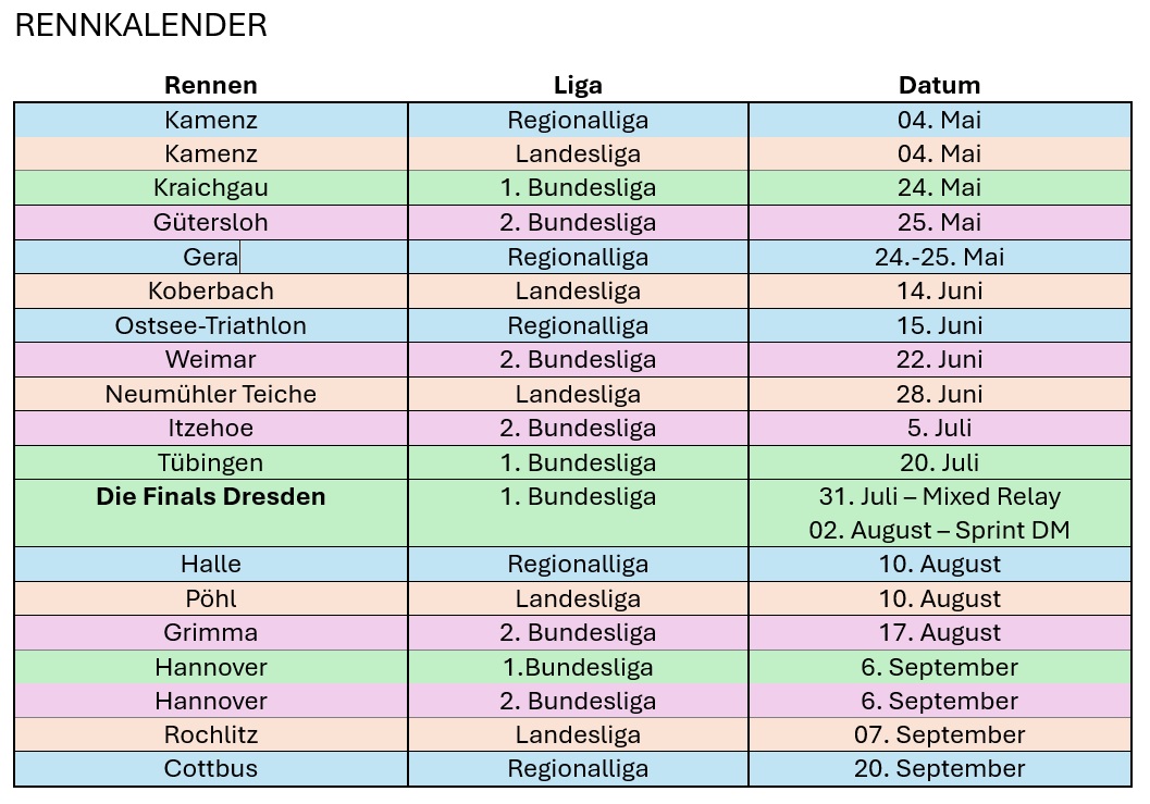 Für das Frauenteam stehen in diesem Jahr 10 Rennen verteilt auf die 1. und 2. Bundesliga an. Klares Highlight sind hierbei natürlich „Die Finals“ in Dresden. Aber es warten auch 2 weitere mitteldeutsche Rennen in Weimar und Grimma auf uns.