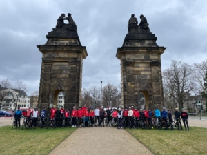 Den Vereinsbus bis unter das Dach beladen geht es Richtung Großer Garten zum Treffpunkt am Osttor – und dort steht schon eine beachtliche Gruppe, die in den folgenden Minuten noch merklich größer werden sollte. So viele hatte wir noch nie zusammen, also schnell die Kamera gezückt
