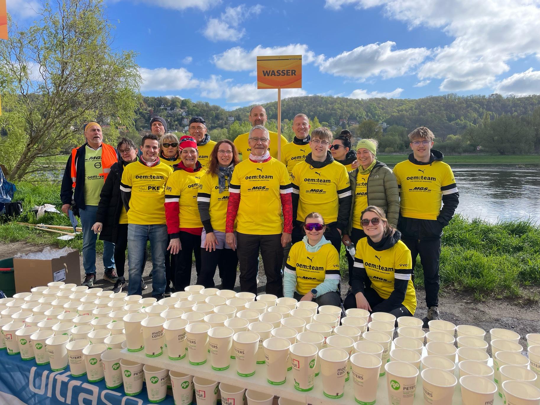 Der Verpflegungsstand in Laubegast war auch in diesem Jahr einer der schönsten Einsatzorte beim Oberelbemarathon – direkt an der Elbe gelegen, mit weitem Blick über das Wasser und einer Sonne, die uns von früh bis spät begleitet hat. Rund 20 Helferinnen und Helfer des weltbesten Traithlonvereins Dresdens standen dort bereit, alle in leuchtend gelben Helfershirts, die schon von weitem signalisierten: Hier gibt’s Energie, Motivation und ein freundliches Lächeln.