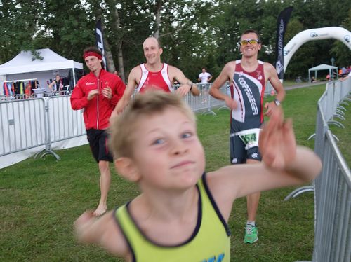 Martin stürzte sich wagemutig in der Startgruppe in den Teich und spulte die 360 m souverän mit nur wenigen Vorausschwimmenden ab. Maxs Position, der nach dem Abschlag an Land etwas konfus die Richtung suchte, war bei Wechsel zu Jörg aufgrund der bereits beginnenden Überrundung nicht mehr auszumachen. Jörg umplätscherte gleichfalls dutzende Brustschwimmer und nach etwas mehr als 12 Minuten schon war wieder Martin mit dem Radl an der Reihe.