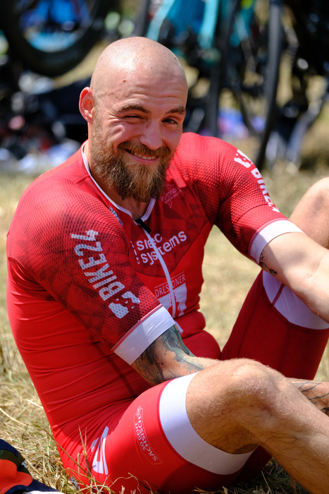 René baut den Transponder von meinem Bein ab und an sein Bein ran, steigt aufs Rad und sein Rennen beginnt. Ziemlich zeitgleich kommt auch Martin aus dem Wasser, so dass Ines nur kurz dahinter auf die Rennstrecke geht.